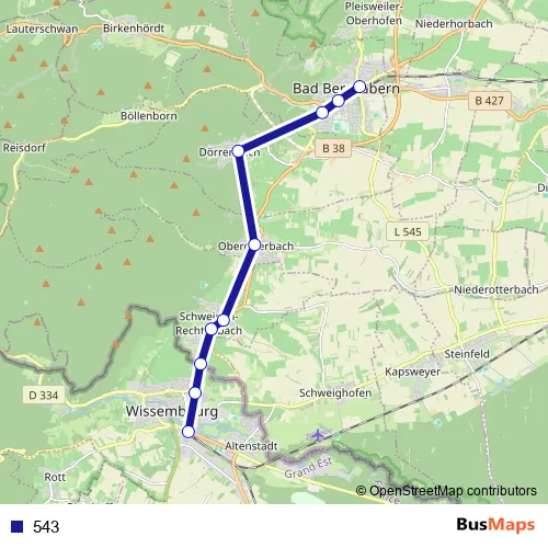 The first stop of the 543 bus route is Bad Bergzabern, Bahnhof and the last stop is Wissembourg, Bahnhof. 543 is operational during everyday.