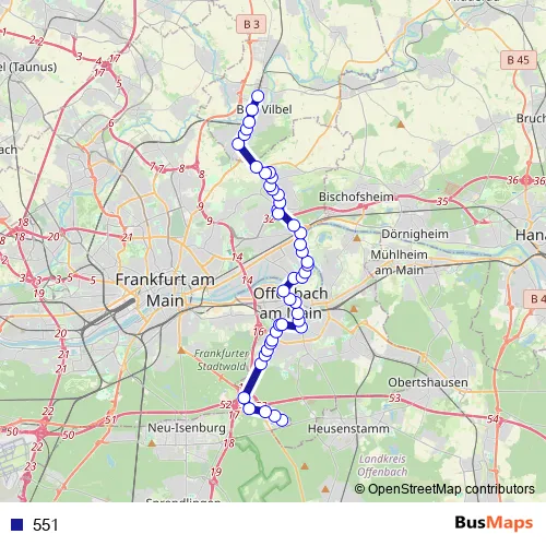 The first stop of the 551 bus route is Neu-Isenburg-Gravenbruch Nachtigallenstraße and the last stop is Bad Vilbel Bahnhof. 551 is operational during everyday.