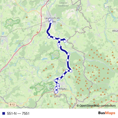 The first stop of the 551-N bus route is Leutkirch, Bahnhof and the last stop is Isny, Felderhalde. 551-N (7551) is operational during on weekdays.