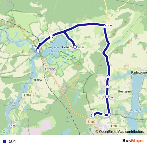 The first stop of the 564 bus route is Brandenburg, Butterlake and the last stop is Pritzerbe, Schule. 564 is operational during on weekdays.