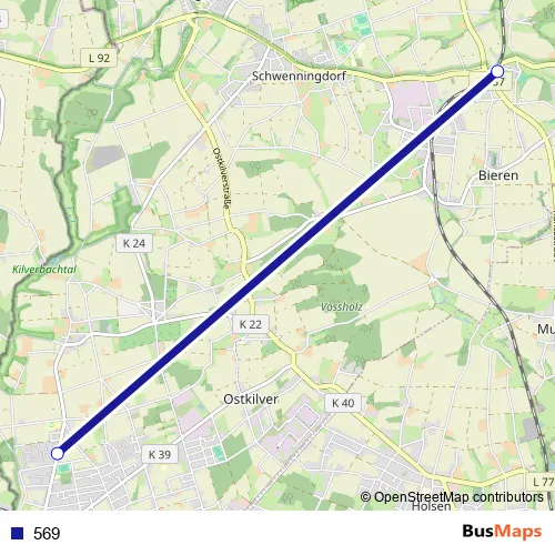 The first stop of the 569 bus route is Röd-Bieren, Grundschule and the last stop is Röd-Westkilver, D-Hülshoff-Str. 569 is operational during on weekdays.
