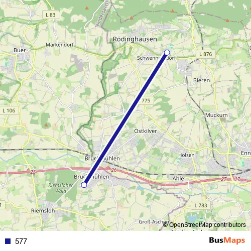 The first stop of the 577 bus route is Rödinghausen, Neue Mitte Zob and the last stop is Bennien Schweizer Weg. 577 is operational during on weekdays.