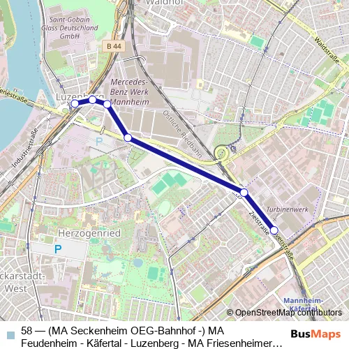 Luzenberg. 58 ((MA Seckenheim OEG-Bahnhof -) MA Feudenheim - Käfertal - Luzenberg - MA Friesenheimer Insel) is operational during everyday.