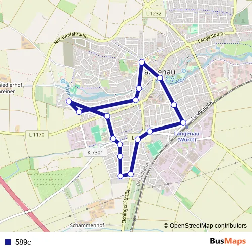 The first stop of the 589c bus route is Langenau Bahnhof and the last stop is Langenau Bahnhof. 589c is operational during everyday.