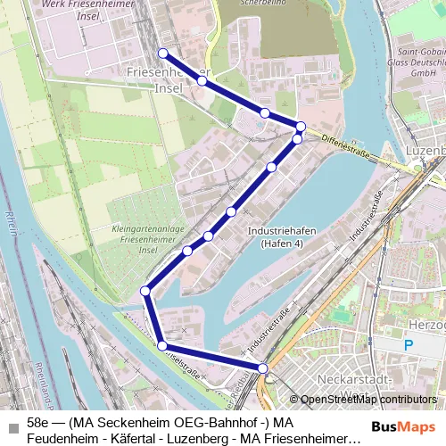 Ölhafenstraße. 58e ((MA Seckenheim OEG-Bahnhof -) MA Feudenheim - Käfertal - Luzenberg - MA Friesenheimer Insel) is operational during everyday.
