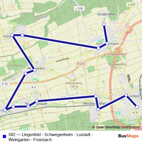 The first stop of the 592 bus route is Lingenfeld, Schulzentrum and the last stop is Schwegenheim, Oberer Waldacker. 592 (Lingenfeld - Schwegenheim - Lustadt - Weingarten - Freisbach) is operational during on weekdays.