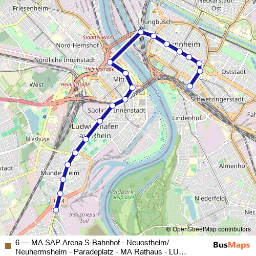 Tram 6 - MA SAP Arena S-Bahnhof - Neuostheim/Neuhermsheim - Paradeplatz - MA Rathaus - LU Rathaus - Berliner Platz - LU Rheingönheim: Full Schedule in Ludwigshafen am Rhein