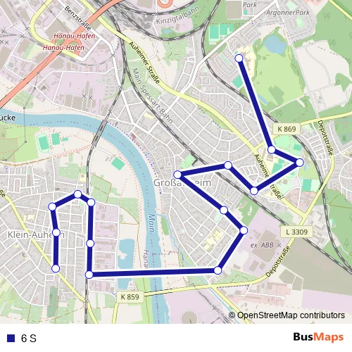 The first stop of the 6 S bus route is Hanau-Wolfgang Paul-Gerhardt-Schule and the last stop is Hanau-Klein-Auheim Friedhof. 6 S is operational during on weekdays.
