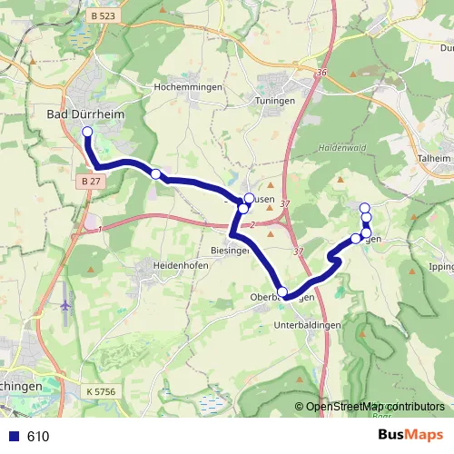 The first stop of the 610 bus route is Bad Dürrheim ZOB Bstg 1 and the last stop is Öfingen Feriendorf. 610 is operational during everyday.