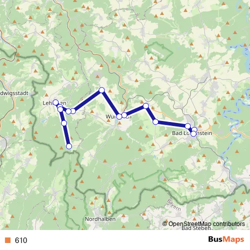 The first stop of the 610 bus route is Bad Lobenstein, Busbahnhof and the last stop is Brennersgrün. 610 is operational during everyday.