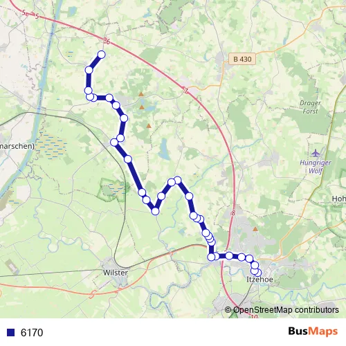 The first stop of the 6170 bus route is Itzehoe Zob and the last stop is Besdorf Bokelrehmer Straße. 6170 is operational during everyday.