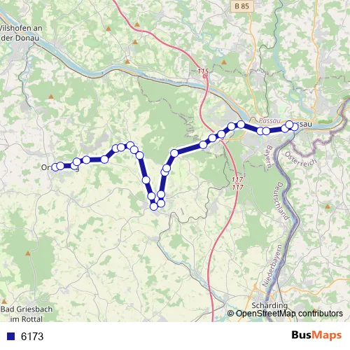 Bahnhofstraße - Passauer Straße - Jägerwirth - Stockerfeld - Holzbacher Straße - Marienplatz - Passauer Straße - Rehschaln - Fürstenzeller Straße - Steinbachstraße - Spitalhofstraße - Nibelungenstraße - Dr.-Hans-Kapfinger-Straße - Europaplatz