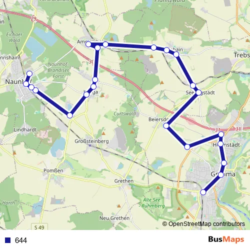 The first stop of the 644 bus route is Grimma, Bahnhof (Bus) and the last stop is Naunhof (b. Grimma), Wurzener Str. (Schule). 644 is operational during everyday.
