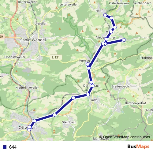The first stop of the 644 bus route is Bahnhof, Hoof St.Wendel and the last stop is Bahnhof, Ottweiler. 644 is operational during on weekdays.