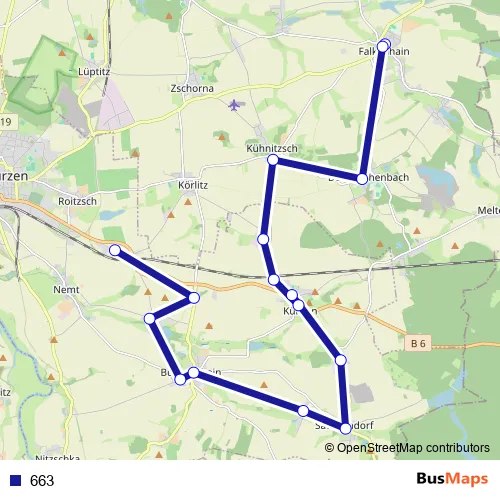 The first stop of the 663 bus route is Falkenhain (Sachsen), Schule and the last stop is Kornhain. 663 is operational during on weekdays.