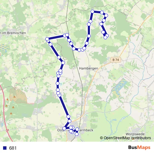 The first stop of the 681 bus route is Osterholz-Scharmbeck, Bahnhof H3 and the last stop is Steden, Schulstraße. 681 is operational during everyday.