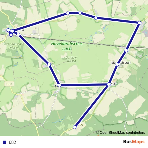 The first stop of the 682 bus route is Nennhausen, Schule and the last stop is Nennhausen, Schule. 682 is operational during on weekdays.