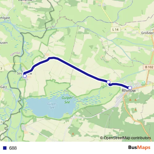 The first stop of the 688 bus route is Strodehne, Wendestelle and the last stop is Rhinow, Grundschule. 688 is operational during on weekdays.