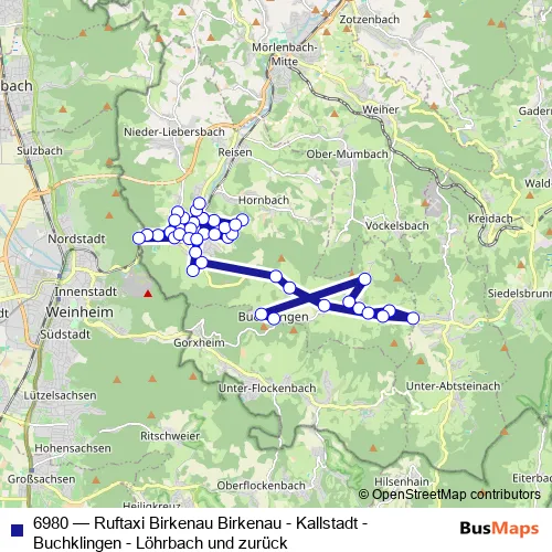 Click here to view the nearest 6980 - Ruftaxi Birkenau Birkenau - Kallstadt - Buchklingen - Löhrbach und zurück bus stop.