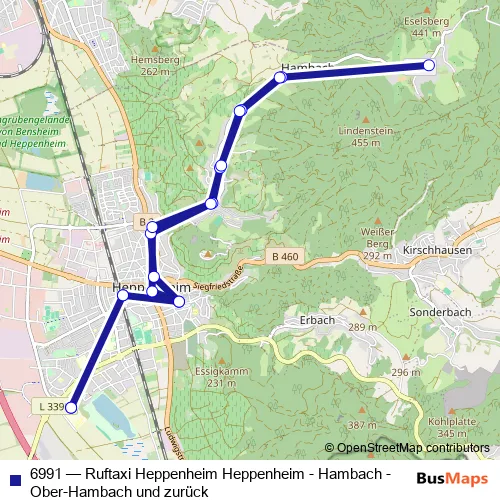Click here to view the nearest 6991 - Ruftaxi Heppenheim Heppenheim - Hambach - Ober-Hambach und zurück bus stop.