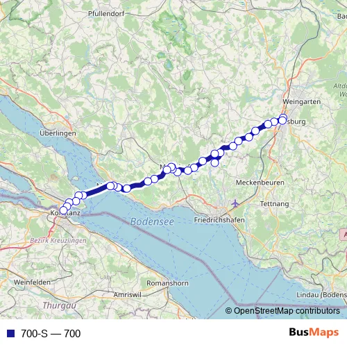 The first stop of the 700-S bus route is Ravensburg, Bahnhof and the last stop is Konstanz Bürgerbüro. 700-S (700) is operational during everyday.