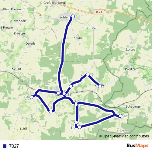 The first stop of the 7027 bus route is Suhlendorf Kirche and the last stop is Suhlendorf Kirche. 7027 is operational during everyday.