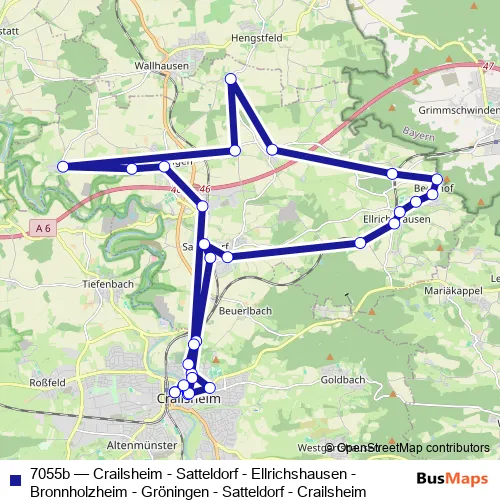 The first stop of the 7055b bus route is Crailsheim Zob and the last stop is Crailsheim Zob. 7055b (Crailsheim - Satteldorf - Ellrichshausen - Bronnholzheim - Gröningen - Satteldorf - Crailsheim) is operational during on weekdays.