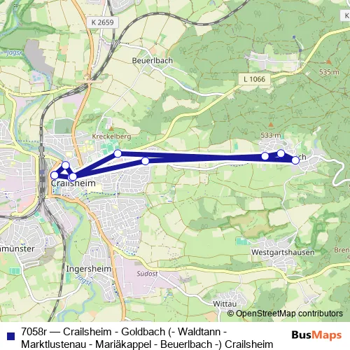 The first stop of the 7058r bus route is Crailsheim Zob and the last stop is Crailsheim Zob. 7058r (Crailsheim - Goldbach (- Waldtann - Marktlustenau - Mariäkappel - Beuerlbach -) Crailsheim) is operational during everyday.