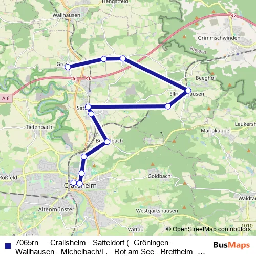 Click here to view the nearest 7065rn - Crailsheim - Satteldorf (- Gröningen - Wallhausen - Michelbach/L. - Rot am See - Brettheim - Blaufelden - Schrozberg) bus stop.