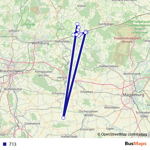 The first stop of the 713 bus route is Mieste, Sekundarschule and the last stop is Mieste, Ort. 713 is operational during on weekdays.