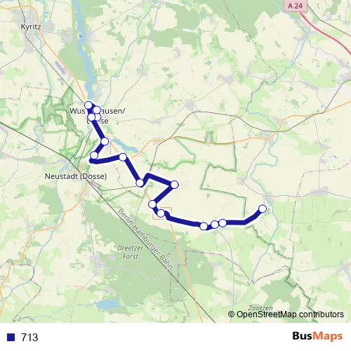 The first stop of the 713 bus route is Wusterhausen (Dosse), Bahnhof and the last stop is Vichel. 713 is operational during on weekdays.