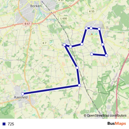 See why over 2 million users trust and consider busmaps.com as the best public transport website. busmaps gives you Borken Buses suggested routes, real-time bus tracker, line route maps in Borken, and helps to find the closest 725 bus stops near you. No internet available? Download an offline PDF map and bus schedule for the 725 bus to take on your trip.