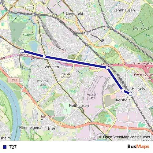 The first stop of the 727 bus route is D-Reisholz S and the last stop is D-Südpark. 727 is operational during everyday.