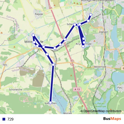 Hauptstraße - Motzener Straße - Töpchiner Straße - Karl-Marx-Straße - Mittenwalder Straße - Motzener Straße - Mittenwalder Straße - Galluner Müllerhaus - Schulstraße - Yorckstraße - Baruther Vorstadt - Rathausstraße - Dahmestraße - Freiherr-von-Loeben-Straße - Krummenseer Straße - Am Weinberg - Hauptstraße - Krummenseer Straße - Freiherr-von-Loeben-Straße - Luckenwalder Straße - Maxim-Gorki-Straße
