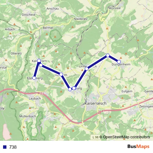 The first stop of the 738 bus route is Düngenheim Kindergarten and the last stop is Eppenberg Kapelle. 738 is operational during on weekdays.