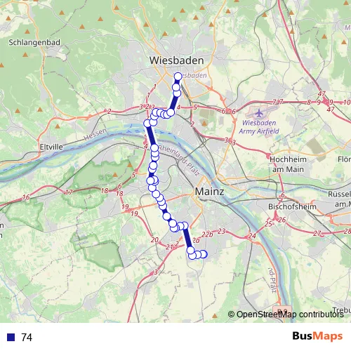 The first stop of the 74 bus route is Hechtsheim, Mühldreieck and the last stop is Wiesbaden Hauptbahnhof. 74 is operational during on weekdays.