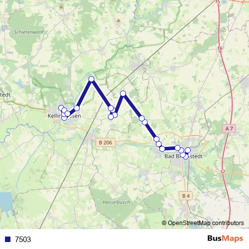The first stop of the 7503 bus route is A Bad Bramstedt and the last stop is Kellinghusen, Grundschule. 7503 is operational during on weekdays.