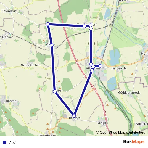 The first stop of the 757 bus route is Schladen(Harz) and the last stop is Schladen(Harz). 757 is operational during everyday.