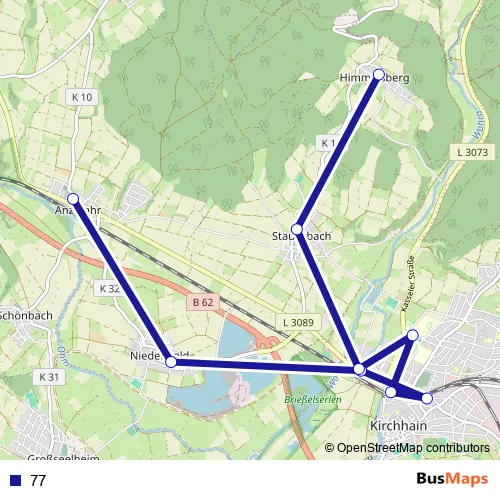 The first stop of the 77 bus route is Kirchhain-Anzefahr Bürgerhaus and the last stop is