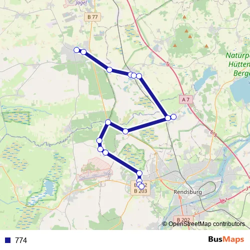The first stop of the 774 bus route is Kropp Schule/Zob and the last stop is Fockbek Dorfplatz. 774 is operational during everyday.