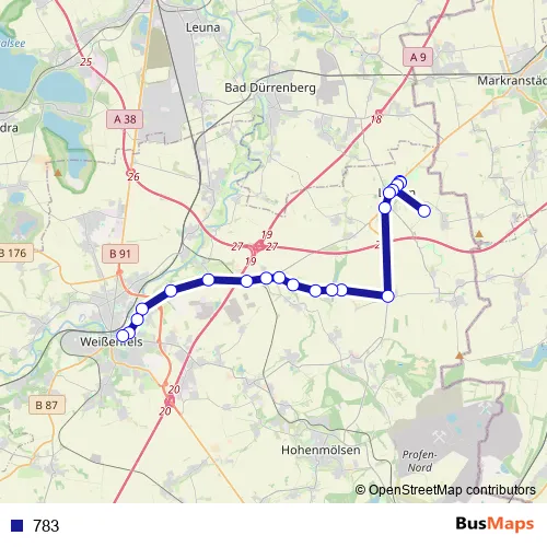 The first stop of the 783 bus route is Meuchen (Lützen), Ort and the last stop is Weißenfels, Busbahnhof. 783 is operational during on weekdays.