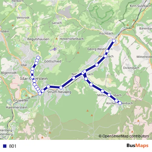 See why over 2 million users trust and consider busmaps.com as the best public transport website. busmaps gives you Idar-Oberstein Buses suggested routes, real-time bus tracker, line route maps in Idar-Oberstein, and helps to find the closest 801 bus stops near you. No internet available? Download an offline PDF map and bus schedule for the 801 bus to take on your trip.