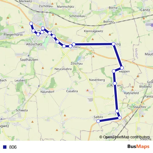 The first stop of the 806 bus route is Oschatz, Betriebshof Wittig and the last stop is Salbitz. 806 is operational during on weekdays.