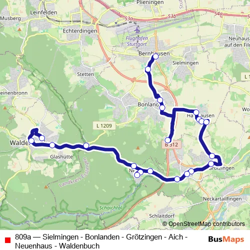The first stop of the 809a bus route is Bernhausen Bahnhof and the last stop is Waldenbuch Hallenbad. 809a (Sielmingen - Bonlanden - Grötzingen - Aich - Neuenhaus - Waldenbuch) is operational during on weekdays.