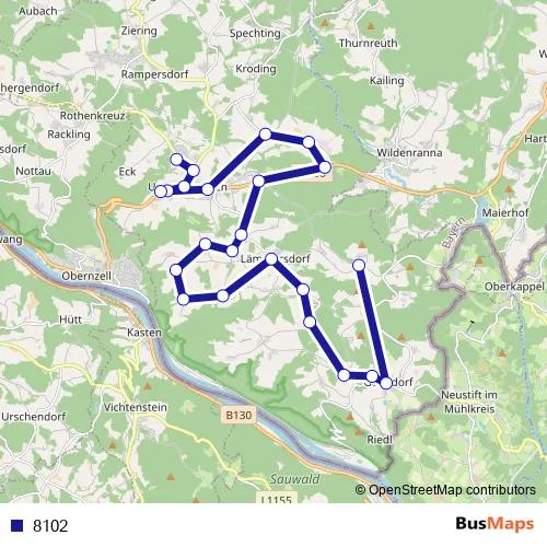 The first stop of the 8102 bus route is Untergriesbach, Gymnasium and the last stop is