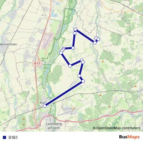 The first stop of the 8161 bus route is Egling a.d.Paar, Römerstraße and the last stop is Kaufering. 8161 is operational during everyday.