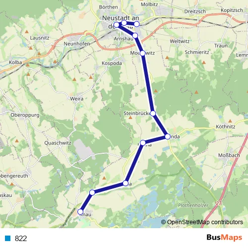 The first stop of the 822 bus route is Knau, Wartehalle and the last stop is Neustadt a.d. Orla, Busbahnhof. 822 is operational during on weekdays.