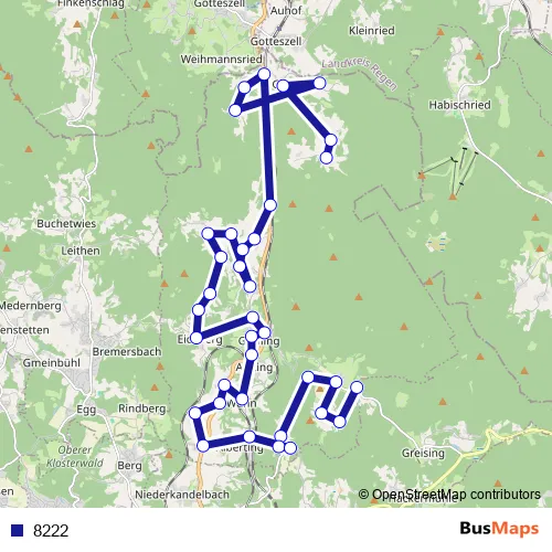 The first stop of the 8222 bus route is Rohrmünzmühle and the last stop is Engelburgsried. 8222 is operational during everyday.