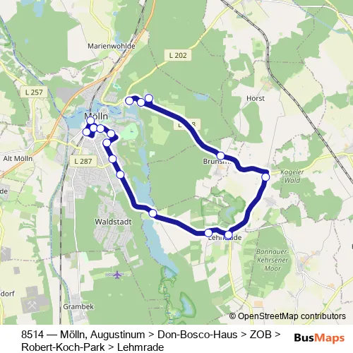 Click here to view the nearest 8514 - Mölln, Augustinum > Don-Bosco-Haus > ZOB > Robert-Koch-Park > Lehmrade bus stop.