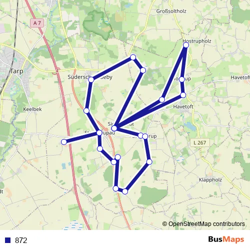 The first stop of the 872 bus route is Sieverstedt Stenderup/Unterdorf and the last stop is Sieverstedt Stenderup/Unterdorf. 872 is operational during on weekdays.